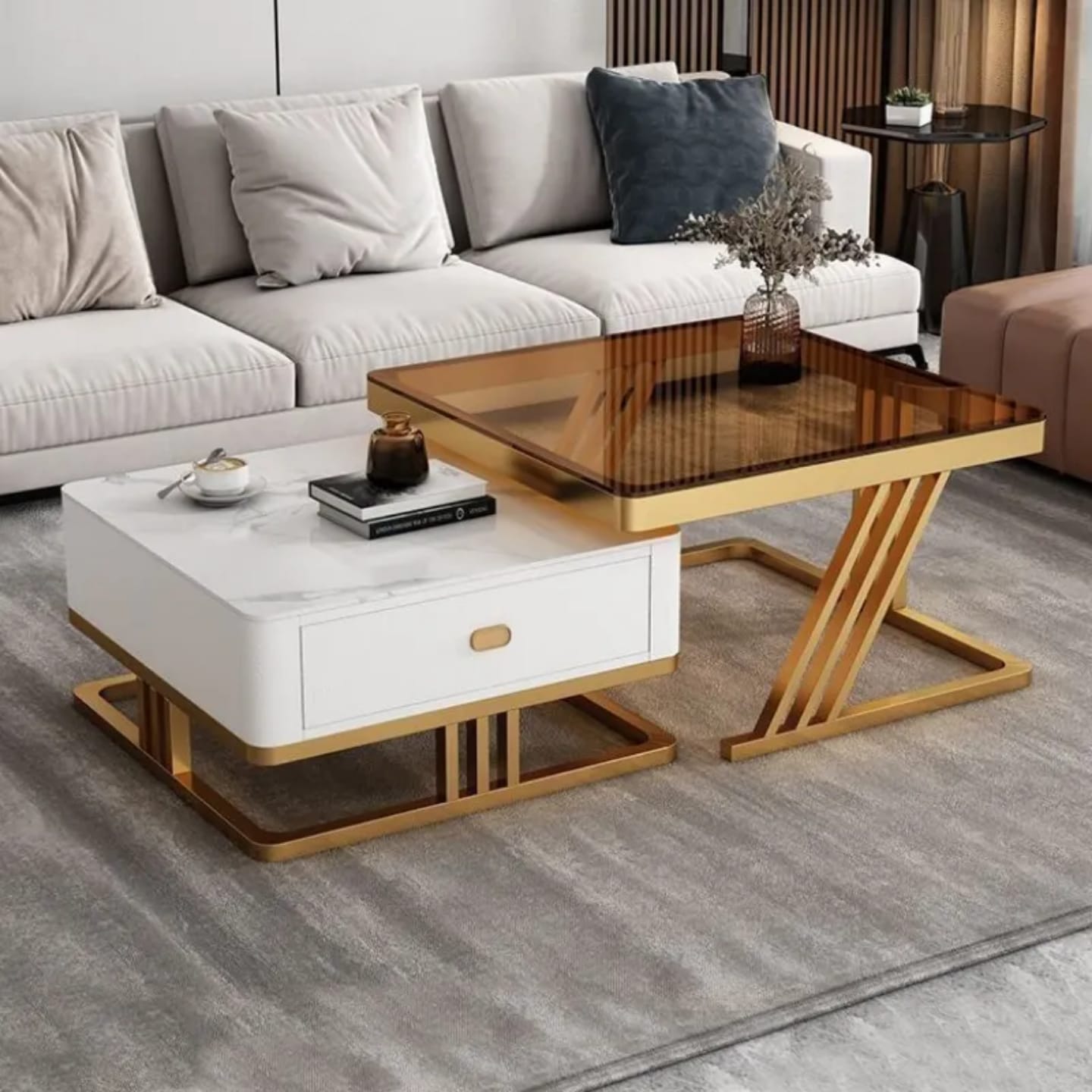Light luxury coffee table, living room, modern and simple home. New square rock slab glass coffee table for small apartments.