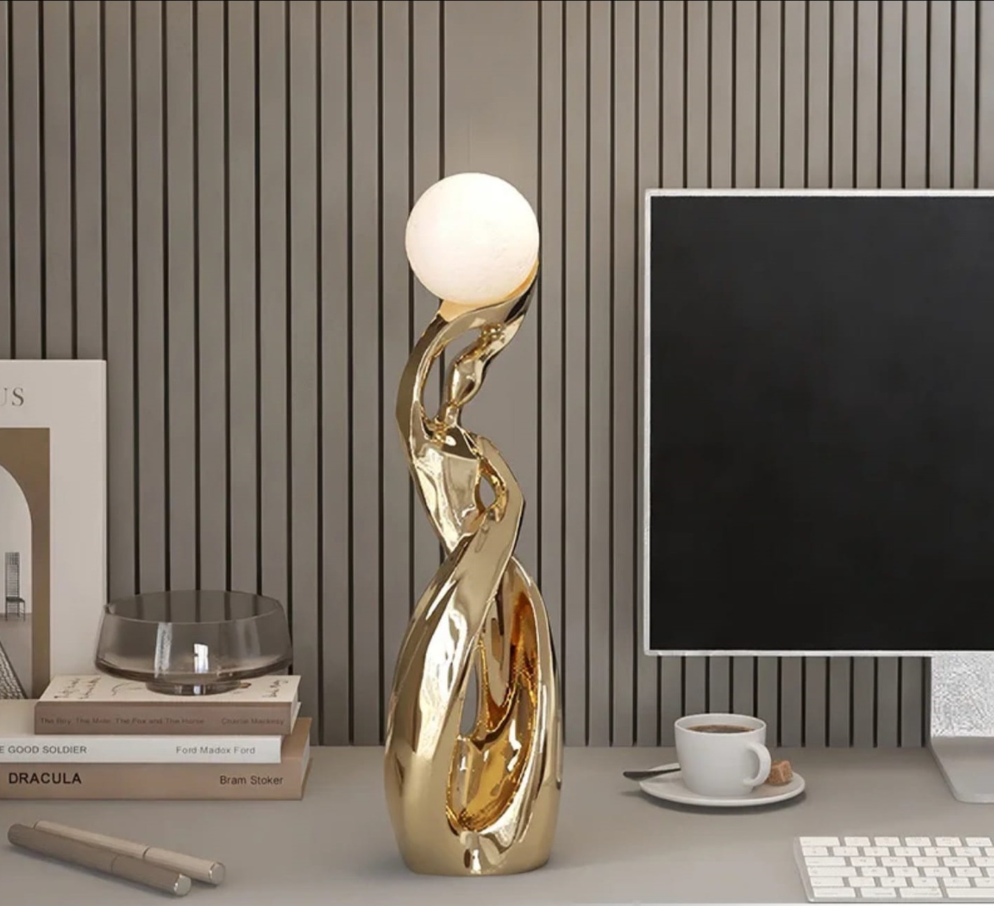 Add a touch of modern elegance to your home with the Eternal Glow sculptural lamp. Crafted from high-quality materials, this lamp features a unique design that doubles as a functional light source and a stunning piece of art. The sleek and minimalist aesthetic makes it the perfect addition to any contemporary living space, and the soft, warm glow it emits creates a cozy atmosphere in any room.Whether placed on a side table, console, or nightstand, the Eternal Glow lamp is sure to become a focal point in your home decor.