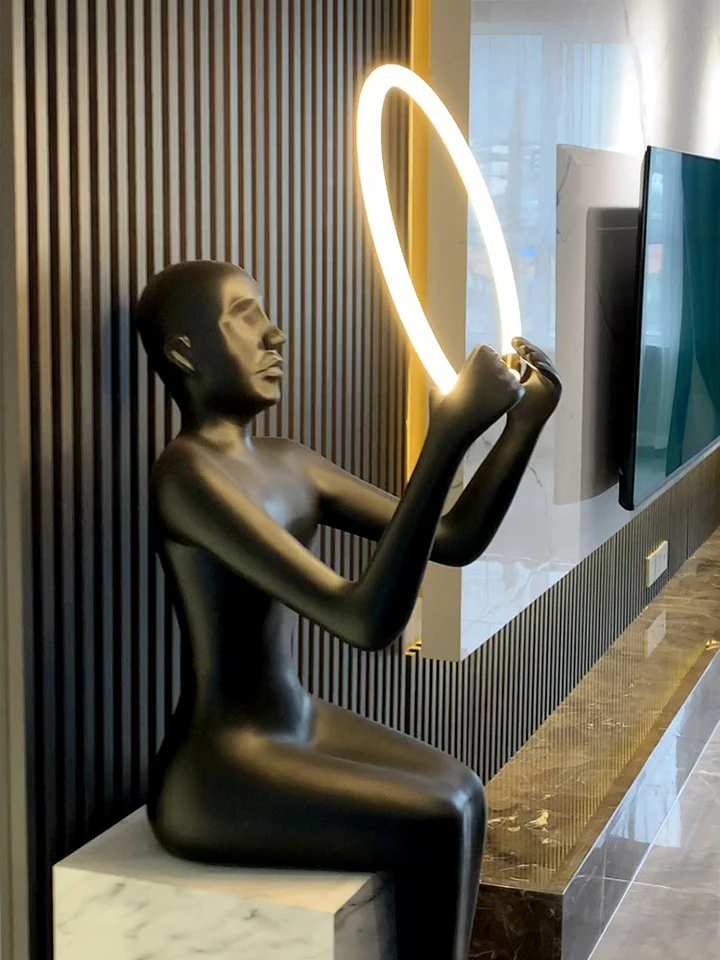 “Sculptural Lamp: Female Reflection,” a stunning addition to your home decor that will bring an air of sophistication and elegance to any room. Crafted from high-quality materials, this lamp features a minimalist and contemporary female figure design that will serve as a conversation-starter in any space. The soft, warm glow emitted from the lamp creates a soothing atmosphere, making it perfect for a cozy night in or for adding a touch of ambient lighting to your living room or bedroom. Whether placed on a bedside table, console, or mantel, the “Sculptural Lamp: Female Reflection” will complement any modern or eclectic interior design style.